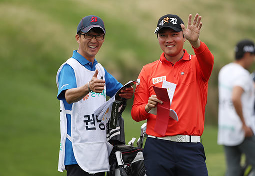 캐디와 함께 환한 미소를 짓고 있는 권명호(오른쪽). 사진제공 | KPGA