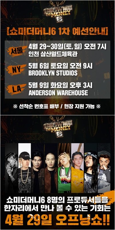 이번 ‘쇼미더머니6’ 미국 예선은 LA와 더불어 시즌 최초로 뉴욕에서도 진행된다. 방식은 한국 예선과 같으며 현지 시각으로 5월 6일(토)에 뉴욕 BROOKLYN STUDIOS, 9일(화)에 LA ANDERSON WAREHOUSE 에서 치러질 예정이다.