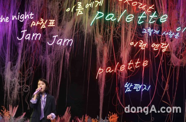 가수 아이유가 21일 오후 서울 마포구 신한카드 판스퀘어 라이브홀에서 열린 정규 4집 앨범 \'팔레트\' 음감회에서 포토타임을 하고 있다.