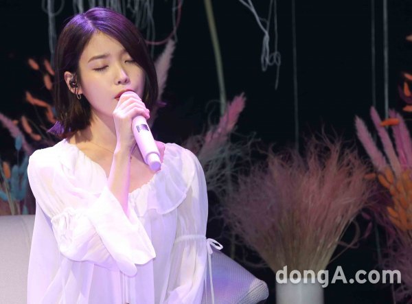 가수 아이유가 21일 오후 서울 마포구 신한카드 판스퀘어 라이브홀에서 열린 정규 4집 앨범 \'팔레트\' 음감회에서 신곡 무대를 선보이고 있다.