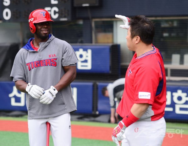 경기를 앞두고 KIA 버나디나와 최형우(오른쪽)가 대화를 나누고 있다.