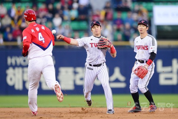 2회초 무사 1루에서 LG 유격수 오지환이 KIA 김선빈의 2루수 앞 땅볼 상황에서 2루로 향하는 서동욱을 포스아웃 시킨 후 1루로 송구하고 있다.