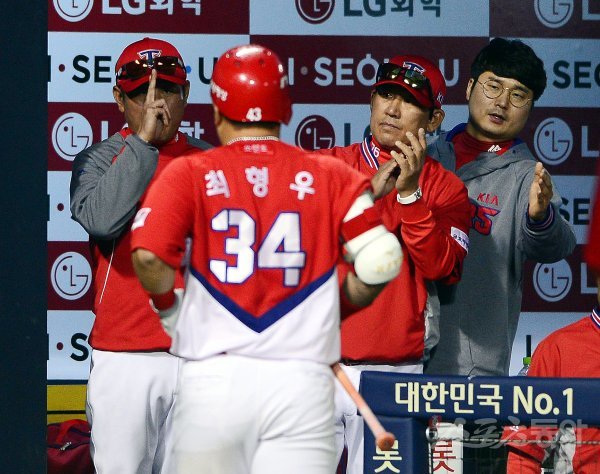 4회초 선두타자로 나온 KIA 최형우가 LG 선발 임찬규를 상대로 솔로홈런을 친 후 김기태 감독의 축하를 받고 있다.