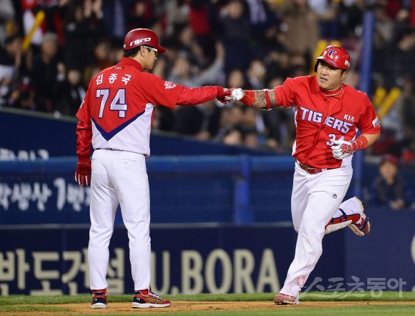 4회초 선두타자로 나온 KIA 최형우가 LG 선발 임찬규를 상대로 솔로홈런을 친 후 김종국 코치와 기쁨을 나누고 있다.
