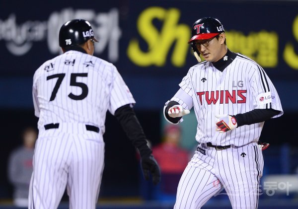 6회말 선두타자로 나온 LG 박용택이 KIA 선발 팻딘을 상대로 시즌 1로 솔로홈런을 치고 한혁수 코치의 축하를 받고 있다.