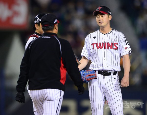 8회초 1사 LG 진해수가 KIA 이명기에게 안타를 허용한 후 교체를 위해 마운드에 올라오는 강상수 투수코치를 바라보고 있다.