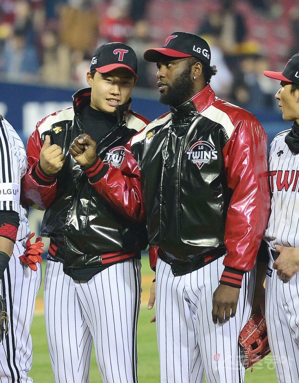 경기 후 LG 임찬규가 소사(오른쪽)와 하이파이브를 나누고 있다.