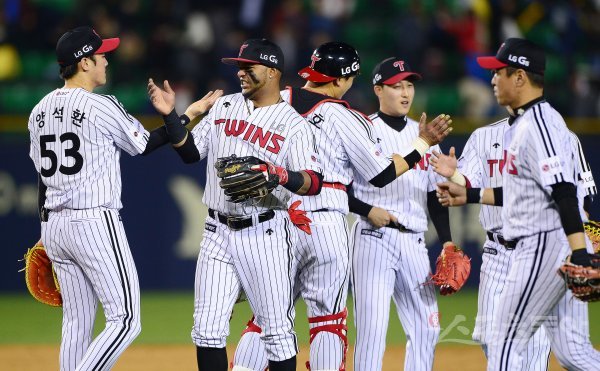 경기 후 LG 선수들이 기쁨을 나누고 있다.