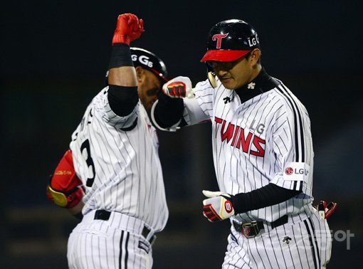 21일 잠실야구장에서 ‘2017 타이어뱅크 KBO 리그’ LG트윈스와 KIA타이거즈의 경기가 열렸다.6회말 선두타자로 나온 LG 박용택이 KIA 선발 팻딘을 상대로 시즌 1로 솔로홈런을 치고 히메네스와 세리머니를 펼치고 있다. 잠실 | 김진환 기자 kwangshin00@donga.com