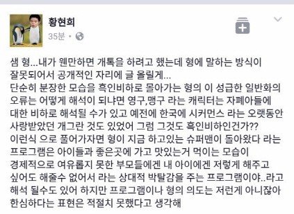황현희는 22일 페이스북을 통해 “샘 형. 형의 말하는 방식이 잘못되어서 공개적인 자리에 올린다”는 글을 남겼다.