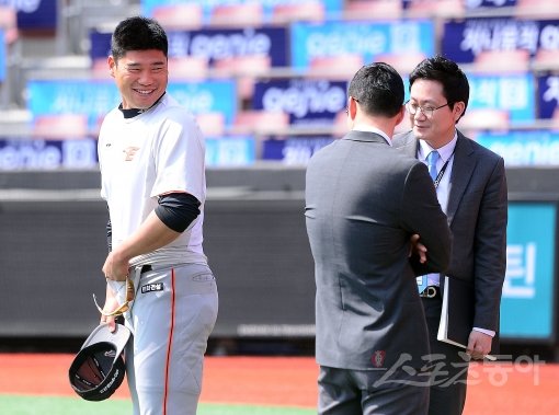 22일 수원 kt위즈파크에서 ‘2017 타이어뱅크 KBO리그’ kt위즈와 한화이글스의 경기가 열린다. 경기를 앞두고 한화 최진행이 김재현 해설위원(오른쪽)과 웃으며 대화를 나누고 있다. 수원 | 김진환 기자 kwangshin00@donga.com