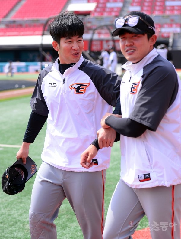 22일 수원 kt위즈파크에서 ‘2017 타이어뱅크 KBO리그’ kt위즈와 한화이글스의 경기가 열린다. 경기를 앞두고 한화 최재훈이 오선진(오른쪽)과 장난을 치며 그라운드를 나서고 있다. 수원 | 김진환 기자 kwangshin00@donga.com