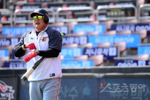 22일 수원 kt위즈파크에서 ‘2017 타이어뱅크 KBO리그’ kt위즈와 한화이글스의 경기가 열린다. 경기를 앞두고 한화 김태균이 배팅 훈련을 하는 중 장갑을 고쳐 끼고 있다. 수원 | 김진환 기자 kwangshin00@donga.com