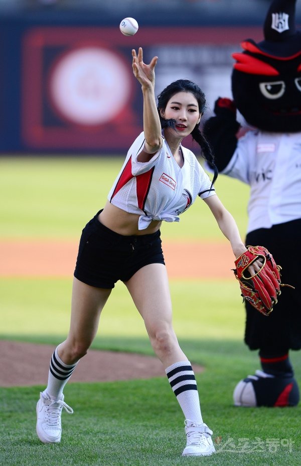22일 수원 kt위즈파크에서 ‘2017 타이어뱅크 KBO리그’ kt위즈와 한화이글스의 경기가 열렸다. 경기를 앞두고 걸그룹 HUB의 루이가 시구를 하고 있다. 수원 | 김진환 기자 kwangshin00@donga.com