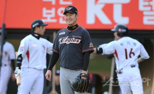 22일 수원 kt위즈파크에서 ‘2017 타이어뱅크 KBO리그’ kt위즈와 한화이글스의 경기가 열렸다. 한화 선발 송은범이 3회말 무사 1,3루에서 kt 박기혁을 협살로 아웃시킨 후 미소를 짓고 있다. 수원 | 김진환 기자 kwangshin00@donga.com