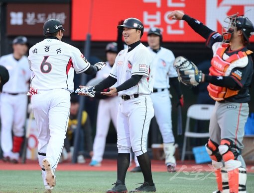 22일 수원 kt위즈파크에서 ‘2017 타이어뱅크 KBO리그’ kt위즈와 한화이글스의 경기가 열렸다. kt 이진영이 5회말 무사 1루에서 한화 심수창을 상대로 투런홈런을 치고 홈을 밟는 박경수를 축하해주고 있다. 수원 | 김진환 기자 kwangshin00@donga.com