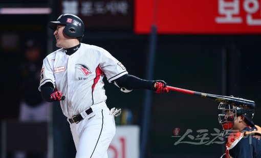 22일 수원 kt위즈파크에서 ‘2017 타이어뱅크 KBO리그’ kt위즈와 한화이글스의 경기가 열렸다. 6회말 2사 1,2루에서 kt 유한준이 적시타를 치고 있다. 수원 | 김진환 기자 kwangshin00@donga.com