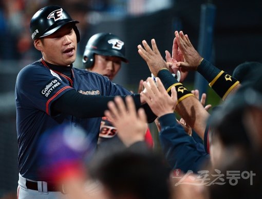 22일 수원 kt위즈파크에서 ‘2017 타이어뱅크 KBO리그’ kt위즈와 한화이글스의 경기가 열렸다. 7회초 2사 2,3루에서 한화 최재훈의 2타점 동점 적시타 때 홈을 밟은 최진행과 하주석(뒤)가 더그아웃에서 동료들의 축하를 받고 있다. 수원 | 김진환 기자 kwangshin00@donga.com