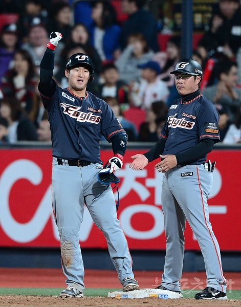 22일 수원 kt위즈파크에서 ‘2017 타이어뱅크 KBO리그’ kt위즈와 한화이글스의 경기가 열렸다. 7회초 2사 2,3루에서 한화 최재훈이 2타점 동점 적시타를 친 후 3루 더그아웃을 향해 환호하고 있다. 수원 | 김진환 기자 kwangshin00@donga.com