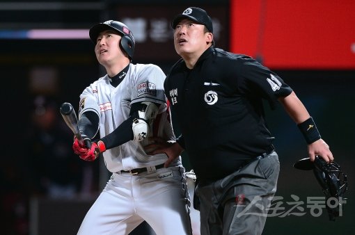 22일 수원 kt위즈파크에서 ‘2017 타이어뱅크 KBO리그’ kt위즈와 한화이글스의 경기가 열렸다. 8회말 1사 kt 유한준의 타구를 배병두 구심이 유심히 지켜보고 있다. 수원 | 김진환 기자 kwangshin00@donga.com