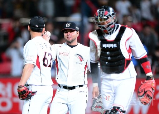 22일 수원 kt위즈파크에서 열린 ‘2017 타이어뱅크 KBO리그’ kt위즈와 한화이글스의 경기에서 kt가 11-9로 승리하며 어제 패배를 설욕했다. 경기 후 kt 선수들이 기쁨을 나누고 있다. 수원 | 김진환 기자 kwangshin00@donga.com
