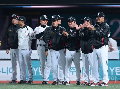 22일 수원 kt위즈파크에서 열린 ‘2017 타이어뱅크 KBO리그’ kt위즈와 한화이글스의 경기에서 kt가 11-9로 승리하며 어제 패배를 설욕했다. 경기 후 통산 150승을 달성한 kt 김진욱 감독을 비롯한 코칭스테프가 선수들을 향해 박수를 치고 있다. 수원 | 김진환 기자 kwangshin00@donga.com