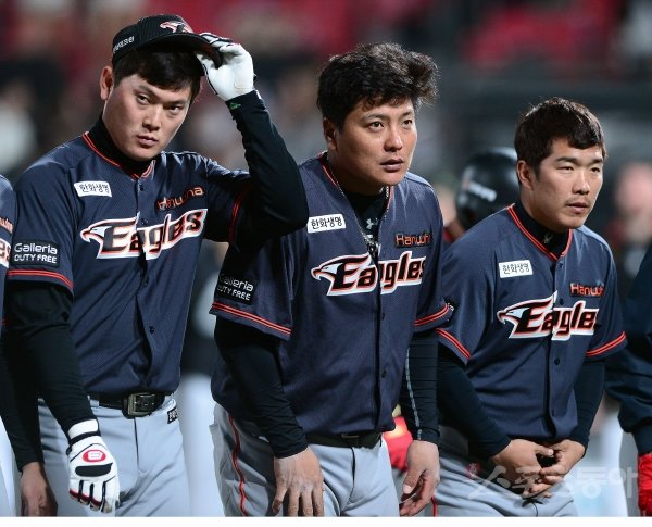 22일 수원 kt위즈파크에서 열린 ‘2017 타이어뱅크 KBO리그’ kt위즈와 한화이글스의 경기에서 kt가 11-9로 승리하며 어제 패배를 설욕했다. 경기 후 한화 김태균(가운데)을 비롯한 선수들이 아쉬운 표정을 지으며 팬들에게 인사를 하고 있다. 수원 | 김진환 기자 kwangshin00@donga.com