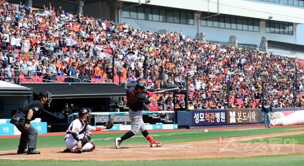 23일 경기도 수원 kt위즈파크에서 ‘2017 타이어뱅크 KBO리그’ kt 위즈와 한화 이글스의 경기가 열렸다. 전날 64경기 연속 출루 신기록을 세운 한화 김태균이 2회초 무사에서 내야안타를 날리며 65경기 연속 출루 기록을 이어가고 있다.