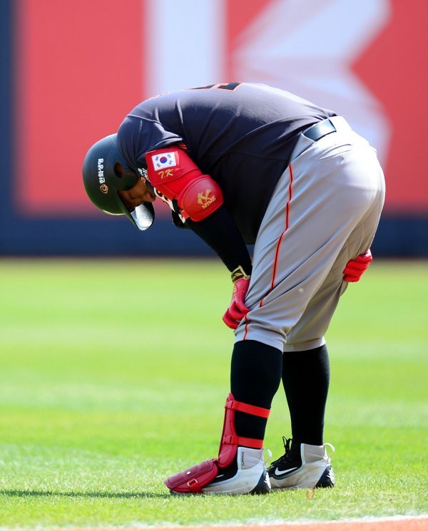 23일 경기도 수원 kt위즈파크에서 ‘2017 타이어뱅크 KBO리그’ kt 위즈와 한화 이글스의 경기가 열렸다. 전날 64경기 연속 출루 신기록을 세운 한화 김태균이 2회초 무사에서 내야안타를 치고난 뒤 허벅지를 잡으며 고통을 호소하고 있다.