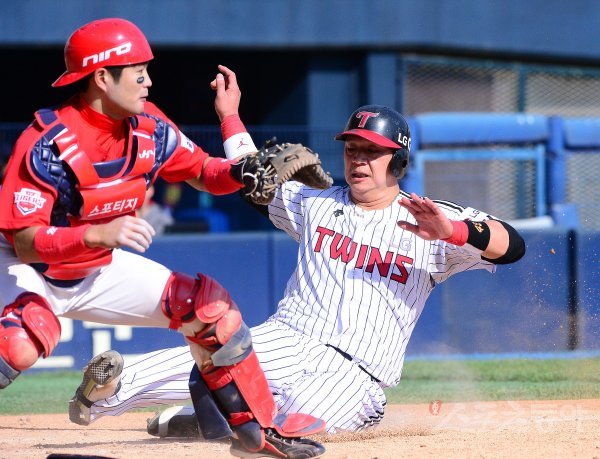 23일 잠실야구장에서 ‘2017 타이어뱅크 KBO 리그’ LG트윈스와 KIA타이거즈의 경기가 열렸다. 5회말 1사 1,3루에서 LG 정상호가 손주인의 희생플라이 때 홈으로 쇄도해 세이프 되고 있다.