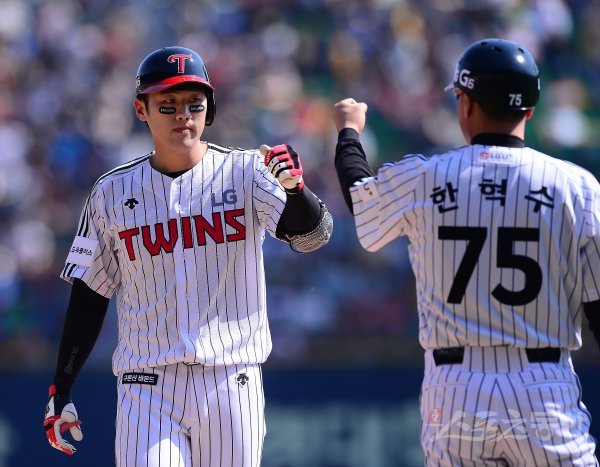 23일 잠실야구장에서 ‘2017 타이어뱅크 KBO 리그’ LG트윈스와 KIA타이거즈의 경기가 열렸다. 3회말 1사 2루에서 LG 양석환이 적시타를 친 후 한혁수 코치의 축하를 받고 있다.