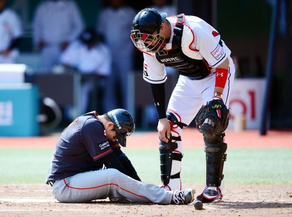 23일 경기도 수원 kt위즈파크에서 ‘2017 타이어뱅크 KBO리그’ kt 위즈와 한화 이글스의 경기가 열렸다. 3회초 무사에서 한화 최재훈이 파울타구에 맞아 고통을 호소하고 있다.