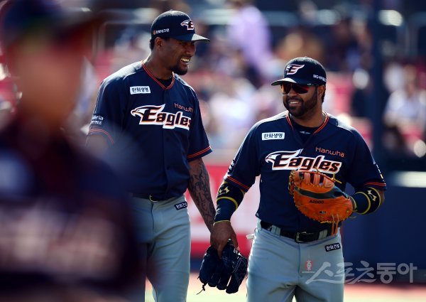 23일 경기도 수원 kt위즈파크에서 ‘2017 타이어뱅크 KBO리그’ kt 위즈와 한화 이글스의 경기가 열렸다. 4회까지 kt 공격을 무실점으로 막은 한화 선발 오간도가 이닝종료 후 로사리오가 이야기를 나누고 있다.