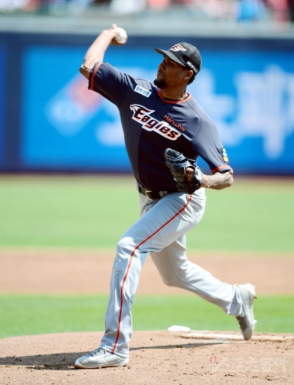 23일 경기도 수원 kt위즈파크에서 ‘2017 타이어뱅크 KBO리그’ kt 위즈와 한화 이글스의 경기가 열렸다. 한화 선발투수 오간도가 힘차게 볼을 던지고 있다.