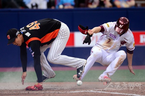 23일 서울 고척스카이돔에서 ‘2017 타이어뱅크 KBO 리그’ 롯데자이언츠와 넥센히어로즈의 경기가 열렸다. 7회말 2사 1,3루 롯데 배장호 와일드피칭 때 3루주자 김하성이 홈으로 달려 세이프되고 있다