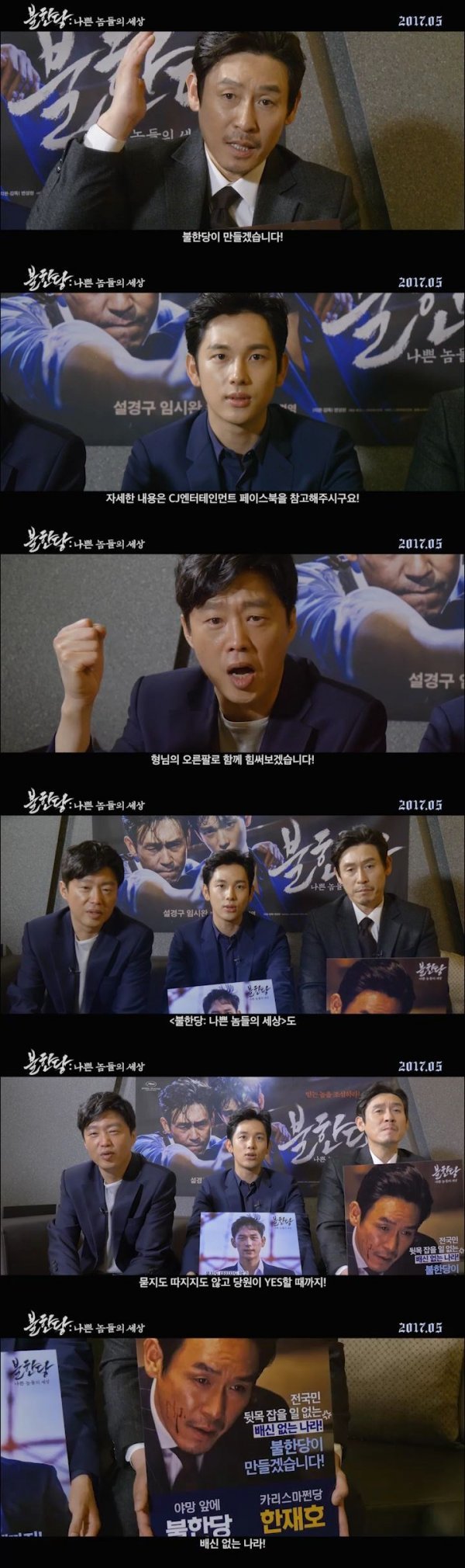 24일 공개된 ‘위풍당당 불한당원 모집영상’은 영화의 주인공 설경구, 임시완 김희원이 직접 당원들에게 축하 인사와 더불어 특별한 혜택을 알려 눈길을 끈다. 마치 선거 유세를 하듯 당당하고 우렁찬 목소리로 첫인사를 건네는 세 남자의 격양된 모습이 웃음을 자아낸다.
