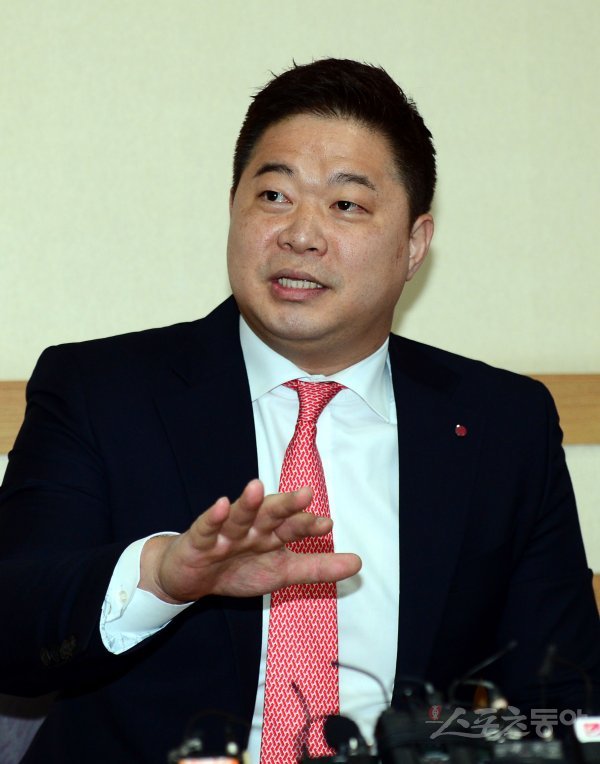 24일 서울 잠실야구장에서 ‘LG세이커스 현주엽 감독 취임식’이 열렸다. LG 7대 감독으로 선임된 현주업 신임감독이 취임소감을 밝히고 있다.