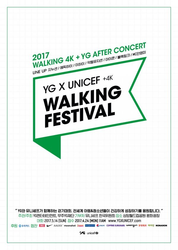 YG는 오는 5월 14일 상암 월드컵 경기장과 평화의 광장에서 참가자 5천여명 규모의 ‘2017 YG X 유니세프 워킹 페스티벌’을 개최한다.