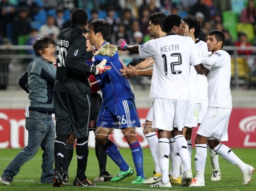 19일 오후 수원월드컵경기장에서 AFC 챔스리그 4강 1차전 수원 삼성(대한민국)과 알 사드(카타르)의 경기가 열렸다. 한 팬이 알사드 골키퍼에게 항의를 하고 있다. 스포츠동아DB
