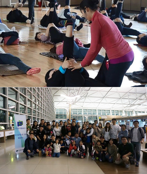 대웅제약 임직원들이 ‘건강하자’ 캠페인 프로그램 중 하나인 건강지킴이 운동을 하고 있다(위). 한국팜비오의 우수임직원과 가족 57명은 지난 12일부터 16일까지 사이판으로 해외여행을 다녀왔다. 사진제공|대웅제약·한국팜비오