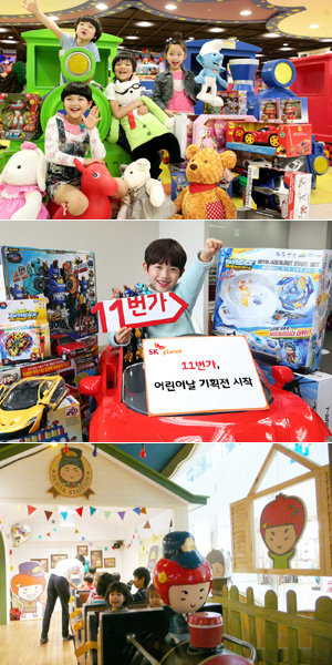 어린이날을 앞두고 유통업계의 ‘키즈 마케팅’이 한창이다. 롯데마트 ‘토이저러스’ 이벤트를 소개하고 있는 어린이들(맨 위쪽). 11번가 ‘해피칠드런스데이’ 이벤트(가운데). 경방 타임스퀘어 내 키즈카페 ‘딸기가 좋아’ 내부 전경. 사진제공 l 롯데마트·11번가·경방 타임스퀘어