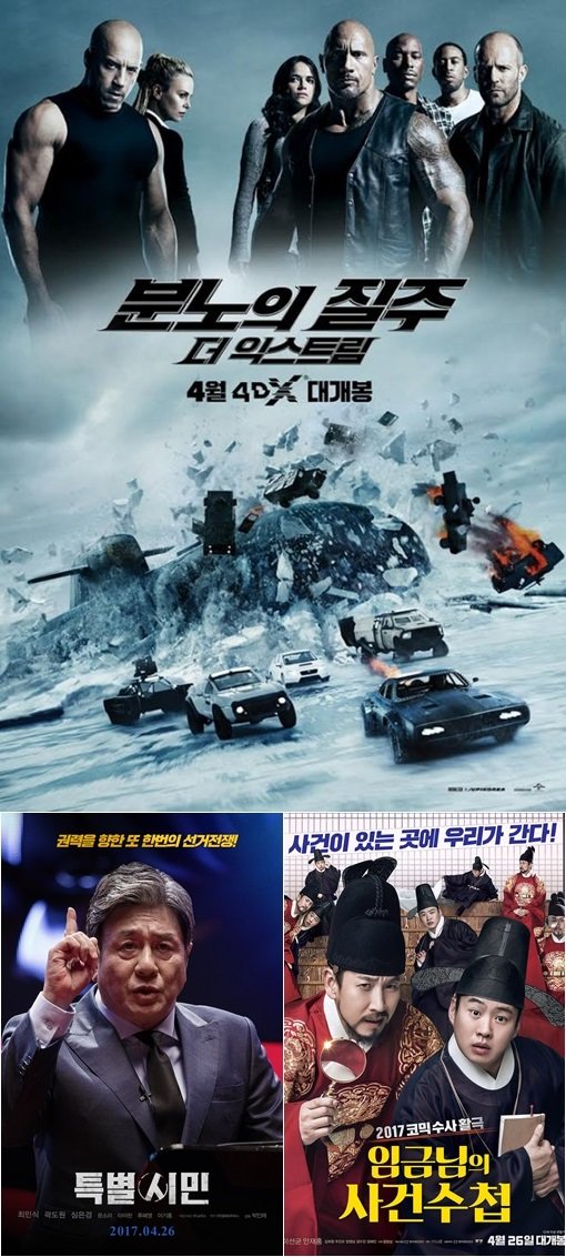 4월 박스오피스는 ‘분노의 질주: 더 익스트림’, ‘아빠는 딸’, ‘미녀와 야수’, ‘프리즌’ 등이 TOP5를 지키고 있는 가운데 두 편의 한국 영화가 순위권에 진입한다면 어떤 변화를 일으킬지에 대해서도 주목되는 바다.