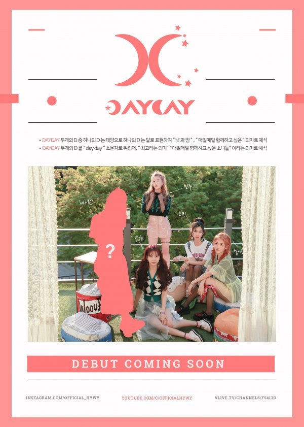 HYWY엔터테인먼트는 26일 0시 SNS 채널을 통해 기존에 공개됐던 멤버 이수현, 전민주, 김은비 외에 새로운 멤버 설아와 실루엣이 포함된 다섯 멤버의 프로필 사진과 팀명 '데이데이(DAYDAY)'를 공개했다.