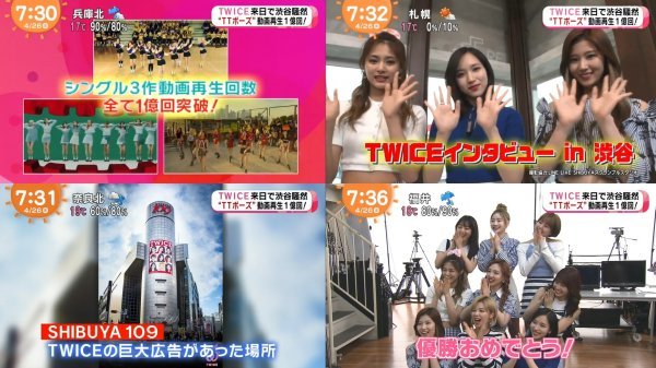 26일 일본 후지TV의 아침 정보프로그램인 \'메자마시TV\'에서는 트와이스가 도쿄 시부야에 등장한 모습이 전파를 탔다. 6월 일본 데뷔에 앞서 지난 20일부터 22일까지 프로모션차 일본을 찾았던 트와이스가 22일 자신들의 대형 실린더 광고가 걸린 패션몰 시부야 109에 깜짝 등장한 장면이 방송됐다.