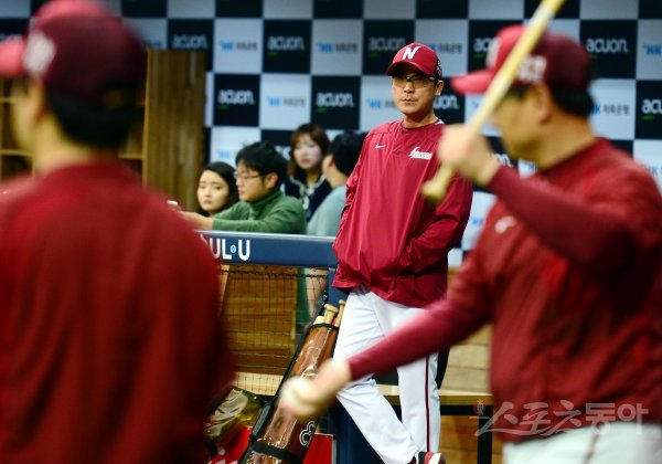 26일 서울 고척스카이돔에서 ‘2017 타이어뱅크 KBO리그’ 넥센 히어로즈와 두산 베어스의 경기가 열린다. 경기전 넥센 장정석 감독이 코치들이 선수들을 훈련시키는 모습을 바라보고 있다.