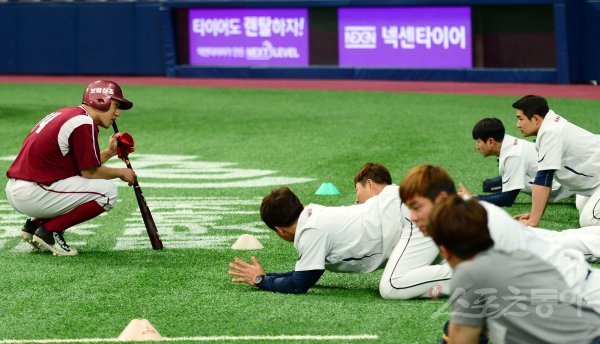 26일 서울 고척스카이돔에서 ‘2017 타이어뱅크 KBO리그’ 넥센 히어로즈와 두산 베어스의 경기가 열린다. 경기전 넥센 서건창이 두산 선수들과 이야기를 나누고 있다.