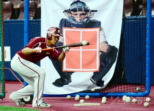 26일 서울 고척스카이돔에서 ‘2017 타이어뱅크 KBO리그’ 넥센 히어로즈와 두산 베어스의 경기가 열린다. 경기전 넥센 송성문이 번트를 훈련하고 있다.