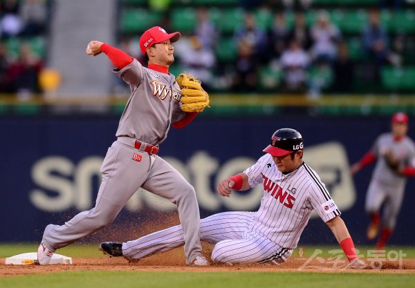 26일 서울 서울 잠실야구장에서 ‘2017 타이어뱅크 KBO 리그’ SK와이번스와 LG트윈스의 경기가 열렸다. 2회말 무사 1루 LG 양석환 내야 땅볼 때 SK 김성현이 1루주자 오지환을 포스 아웃시킨 후 1루로 송구하고 있다.