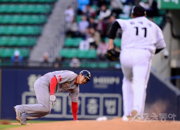 26일 서울 서울 잠실야구장에서 ‘2017 타이어뱅크 KBO 리그’ SK와이번스와 LG트윈스의 경기가 열렸다. 2회초 1사 1루 SK 한동민 타석 때 1루주자 김동엽에 협살에 걸려 아웃되고 있다.