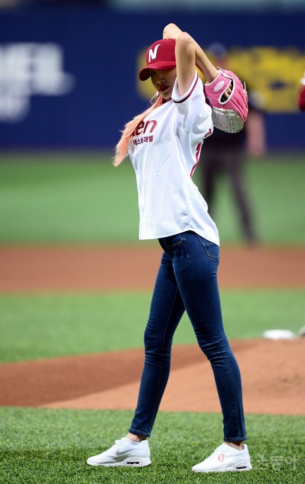 26일 서울 고척스카이돔에서 ‘2017 타이어뱅크 KBO리그’ 넥센 히어로즈와 두산 베어스의 경기가 열렸다. 가수 문현아가 시구를 던지고 있다.